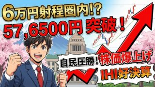 衆院選での自民党圧勝を受け、日経平均は57,000円を突破。歴史的高値を更新し続ける強気相場の展望と、注目銘柄IHI、建設・銀行セクターの動向を解説。個人投資家のリアルな売買記録(INPEX・日本郵政・GGLL)とチャート分析に基づいた反省点も公開します。