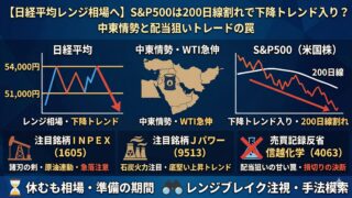 日経平均株価は54,000円の壁に阻まれ、先物は51,000円台へ急落。S&P500も200日移動平均線を割り込む厳しい相場環境の中、来週の投資戦略を徹底考察します。原油高で注目のINPEX・Jパワーの動向や、100万円チャレンジでの信越化学工業(4063)の損切りから学ぶ「配当狙いトレードの難しさ」も解説。