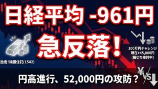 投資日記 【株日記】なぜ日経平均株価が下落したのか?押し目タイミングなのかも予想! 日経平均は前日比961円安と急反落。レートチェックの観測に伴う円高進行が、輸出株や半導体株の重荷となりました。52,000円の支持線を巡る攻防と、逆行高が目立つ「純銀信託(1542)」の分析、100万円チャレンジ中の売買記録と明日の損切り判断についてまとめます。 2026.01.26 投資日記