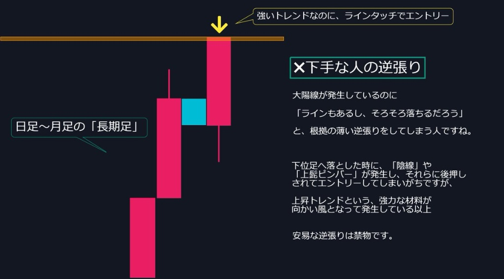 - 強いトレンド中の「値頃感の逆張り」は絶対NG。
