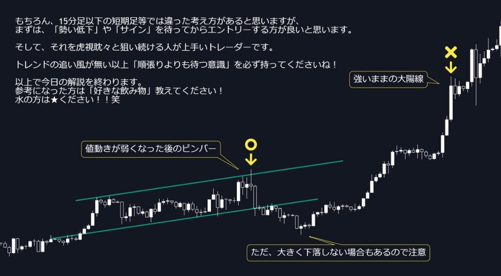 強いままの大陽線で「値頃感ショート」をするのではなく、値動きが弱くなった後のピンバーなどを確認してから、優位性の高いポイントだけで勝負しましょう。