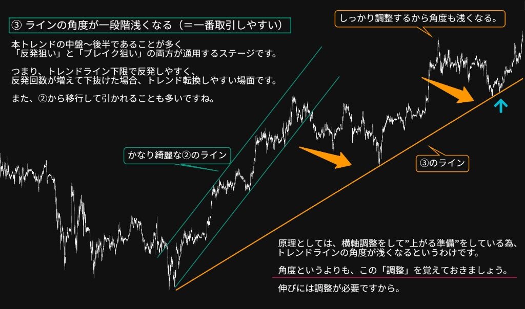 鋭角なトレンドが成熟し、横軸(時間)を使ってしっかりと調整(利益確定の売りなど)をこなすと、トレンドラインの角度が一段階浅くなります。