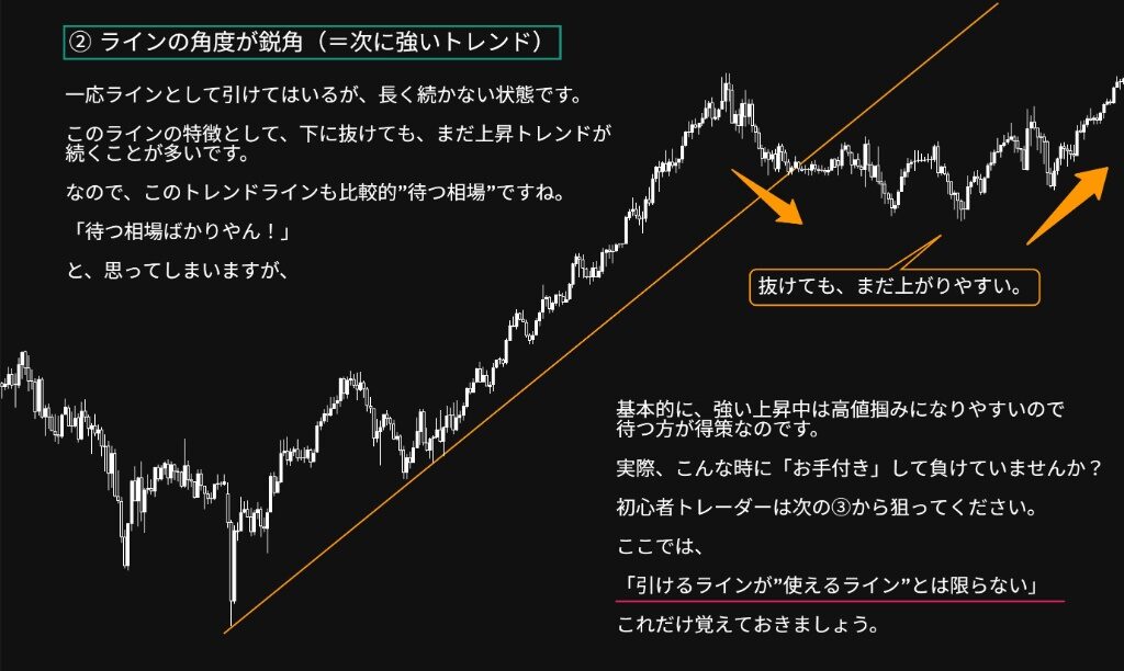 初心者トレーダーは、この鋭角ラインを下抜けた瞬間に「トレンド転換だ!」と飛び乗って(お手付きして)負けがちです。