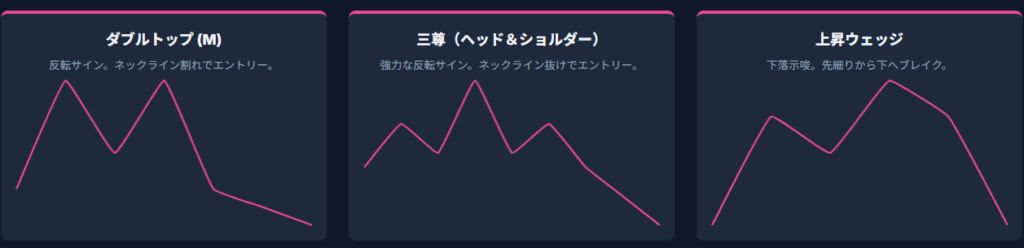 - 2回同じ水準で反発する形。ネックライン(間の谷・山)を越えたらエントリー。
