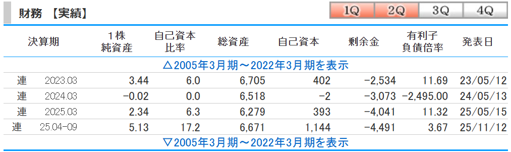 - 直近(25.04-09)で17.2%まで回復していますが、これはおそらく事業で儲けたからではなく、増資(株を新しく刷って売った)によって無理やり資金調達をした結果である可能性が高いです。