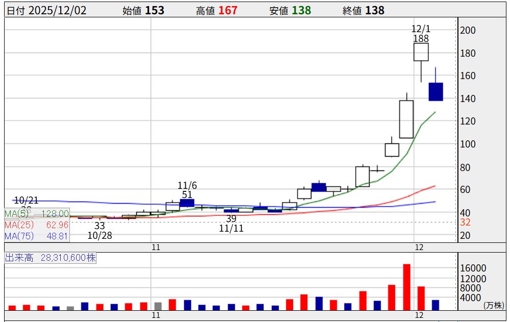 12月1日には一時188円の高値をつけ、わずか1週間あまりで株価が3倍〜4倍になるという異常事態が発生しています。