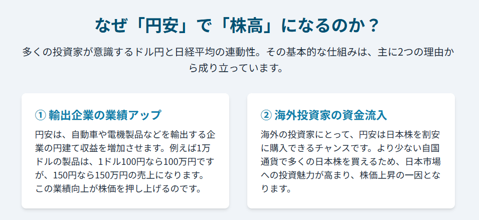 なぜ「円安」が日本の株価(特に日経平均株価)にとってプラスに働くと言われるのでしょうか。