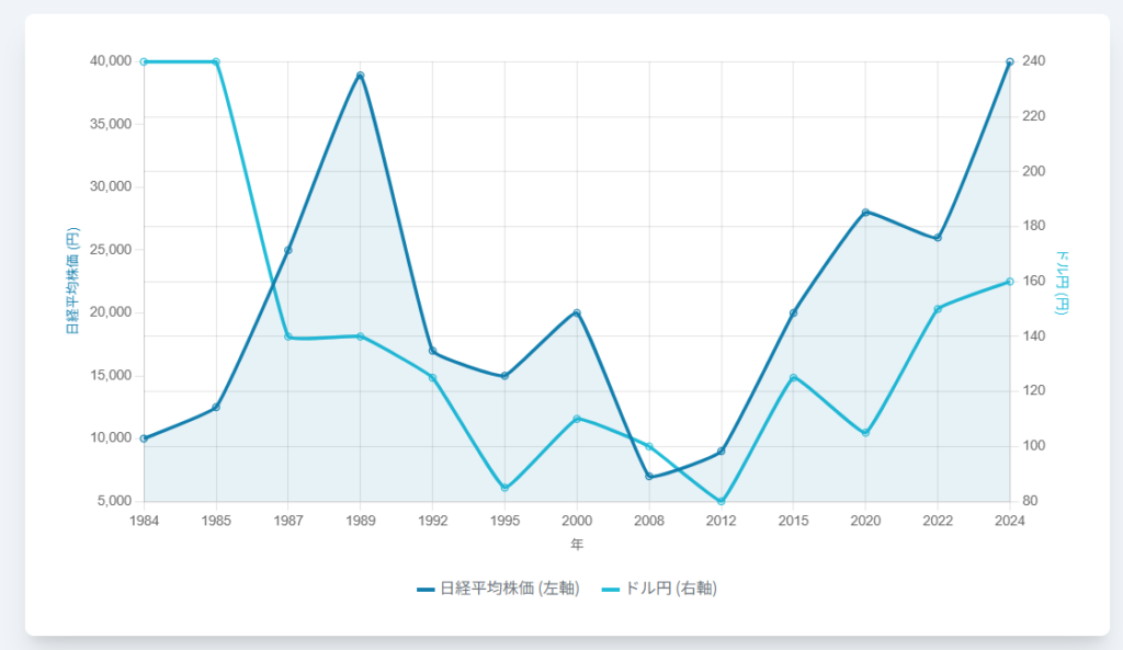 この記事では、バブル期の1984年から2024年までの約40年間にわたる「日経平均株価」と「ドル円相場」の長期的な関係性を徹底分析します。