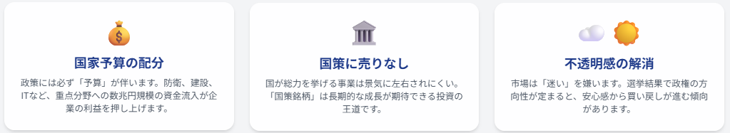 まず、なぜ選挙が株価に影響を与えるのかを整理しましょう。理由は大きく分けて3つあります。