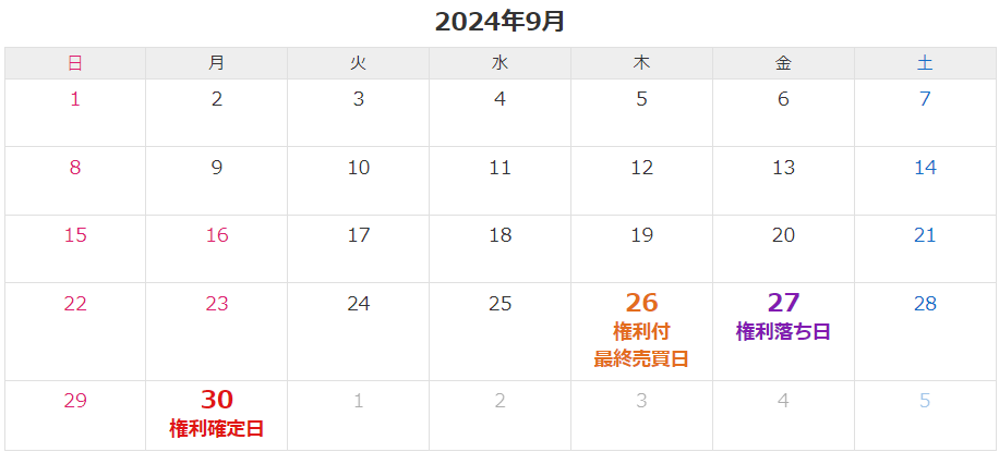 例えば、2024年9月30日(月)が権利確定日の場合、以下のようになります。