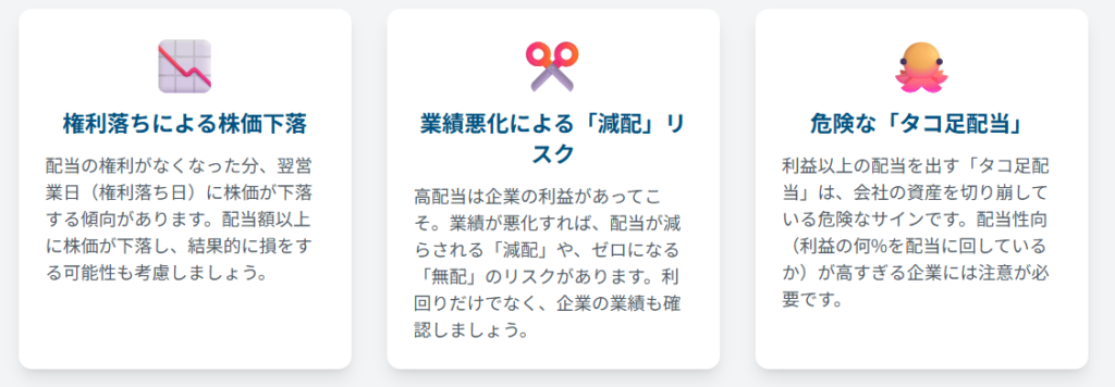 - 「権利落ち」「減配」などのリスクも理解しておくことが重要。