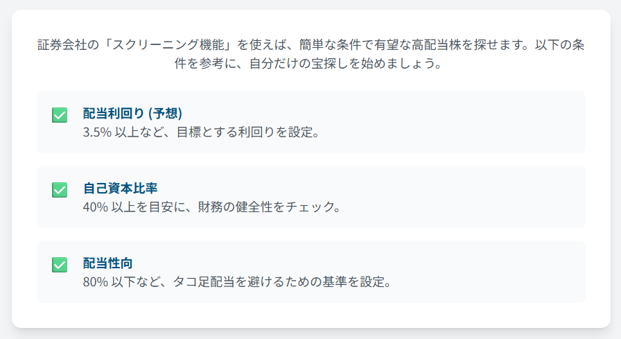 証券会社のウェブサイトやツールが提供する「スクリーニング機能」を使えば、自分で条件を設定して銘柄を探すことができます。