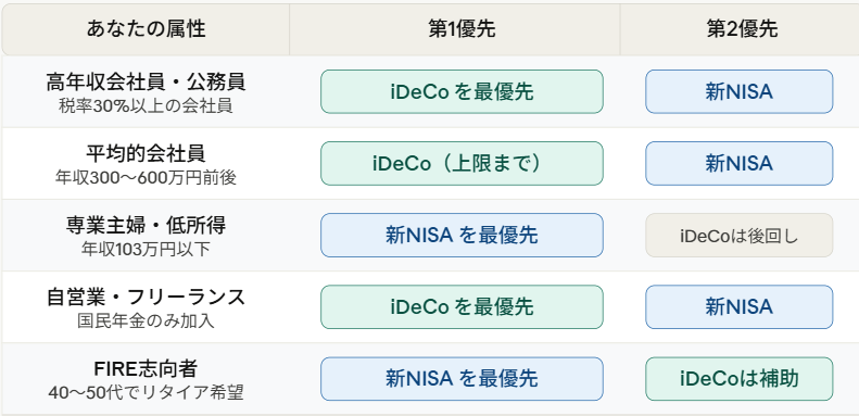 「どれを優先すべきか」という問いへの答えは、個人の属性と資金力によって異なります。