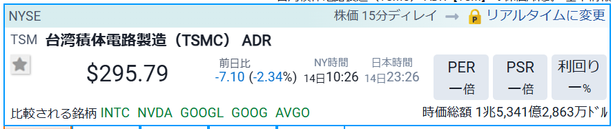 TSMCのADR(TSM)の株価は、直近のデータで1株あたり295ドル前後で推移しています。