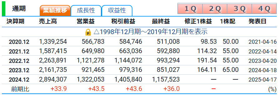 - 2023年は半導体市況の調整で一時的に減速しましたが、2024年予想では売上高が前期比+33.9%、営業利益が+43.5%と、再び驚異的な成長軌道に戻ることが示されています。