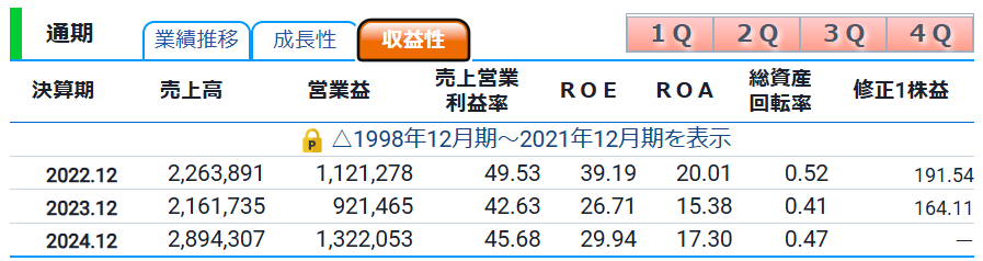 - 営業利益率は40%台後半という、製造業としては異次元の高水準を維持しています。