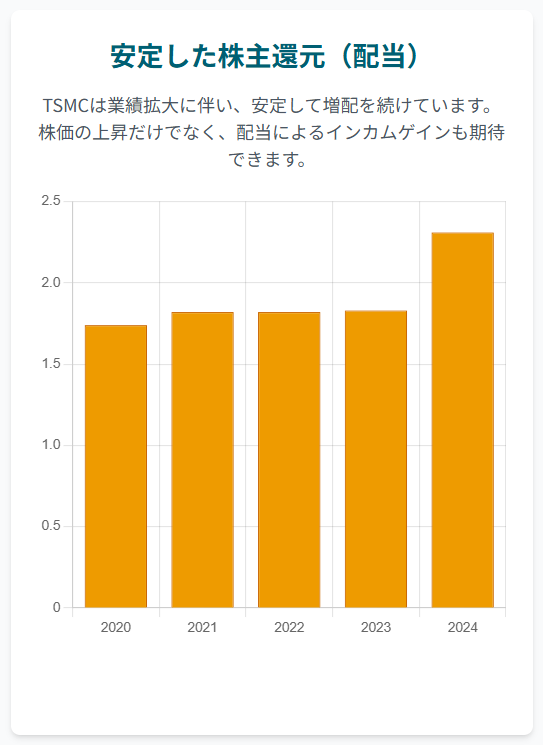 今後もEPS(1株当たり利益)の成長が続く限り、それに伴う増配が期待でき、TSMCは株価の値上がり益(キャピタルゲイン)と配当(インカムゲイン)の両方を狙える「成長・配当株」としての魅力を持っています。