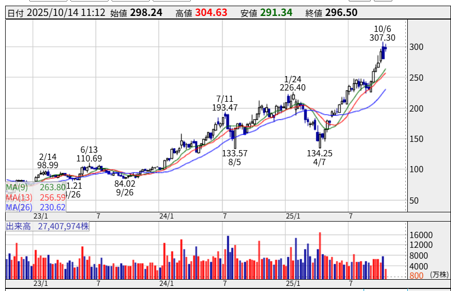 チャートを見ると、2024年初頭の安値圏から2025年後半にかけて、株価は一貫して「高値を更新し、安値を切り上げる」動きを続けています。