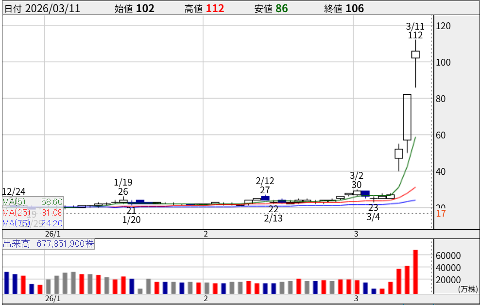 わずか3日間で株価は約4倍となる100円の大台を突破し、一時ストップ高の112円を記録しました。
