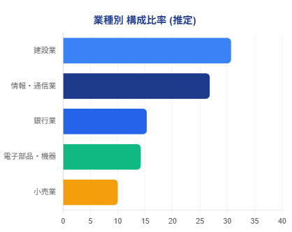 業種別では「情報・通信業(約26%)」がトップですが、中身を見るとテレビ局やジャストシステムなど、財務体質が強固な企業が並びます。