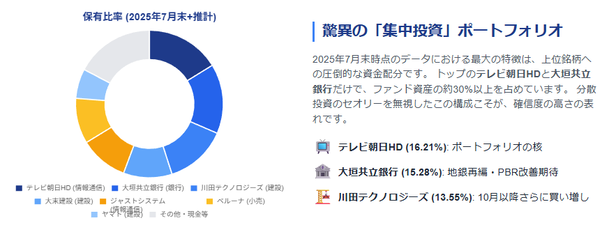 | 1 | テレビ朝日HD (9409) | 16.21% | 情報・通信 | ポートフォリオの核。9月末時点でも保有有力 |