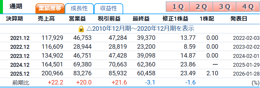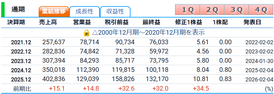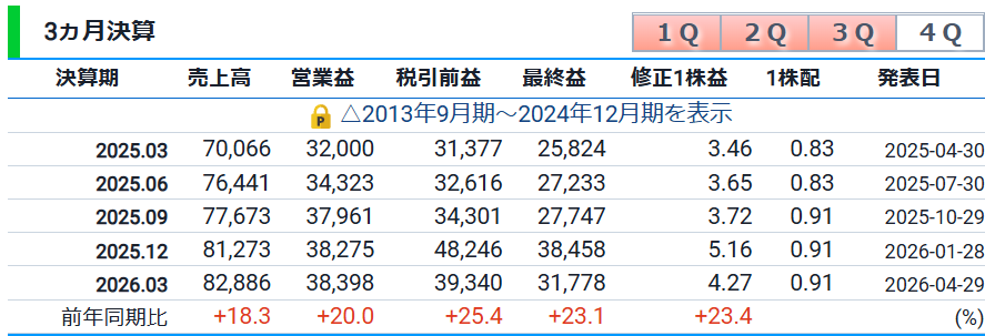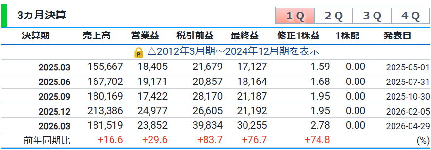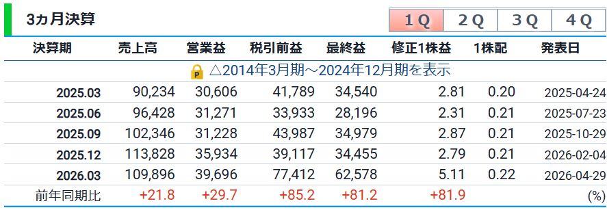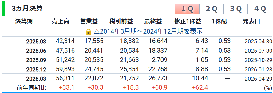 そして今Q1(2026.03)は前年同期比+21.8%と、過去5年で最も高い成長率になっています。