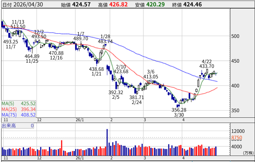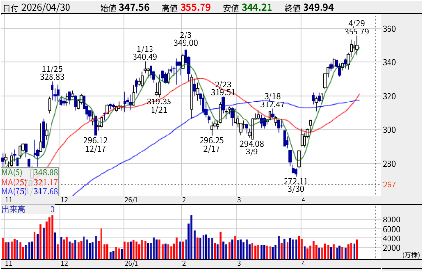 チャートを見ると、株価は2025年11月の328ドルを底に上昇トレンドを形成しています。