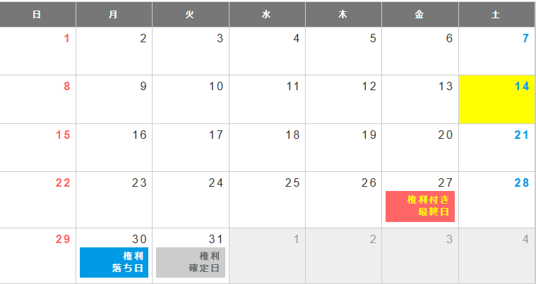 今年の場合、3月27日(金)が権利付最終日となり、3月27日(金)までに株を買っておきましょう。