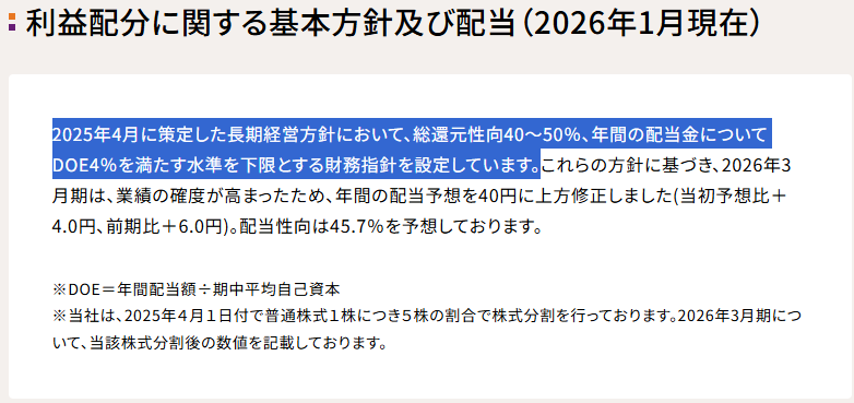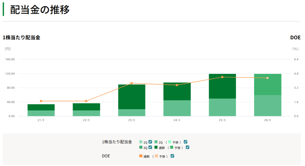 この銘柄の最大の推しポイントは「DOE(株主資本配当率)」を配当方針の基準に採用している点です。
