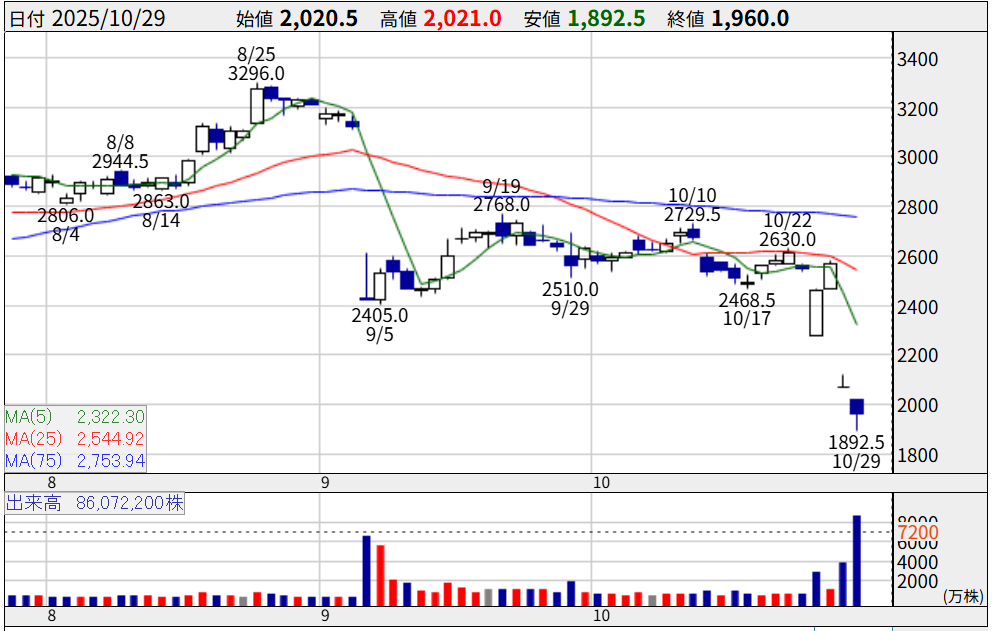 - 10月29日には一時1892.5円まで売られ、終値は1960円。2000円の大台を明確に割り込みました。