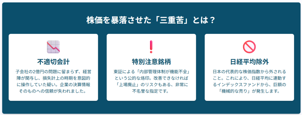 企業統治の根幹を揺るがす「不適切会計」の疑いと、それに伴う「特別注意銘柄」への指定、そして「日経平均株価」からの除外という、まさに”三重苦”とも言える深刻な事態が背景にあります。