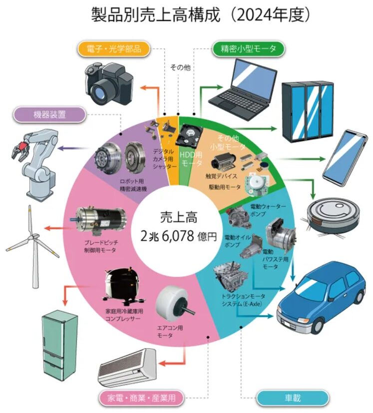 - 「回るもの、動くもの」すべてが事業領域で、ハードディスクドライブ(HDD)用モーターで世界を席巻して以来、家電(冷蔵庫、エアコン)、産業機器、そして近年ではEV(電気自動車)向けなど、幅広く事業を展開しています。
