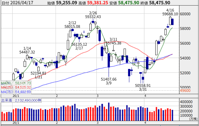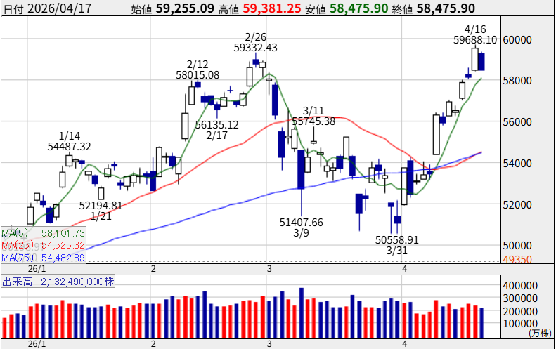 2026年4月16日、日経平均株価は前日比1,384円高の5万9,518円で取引を終え、2月27日につけた5万8,850円を上回り、史上最高値を更新しました。
