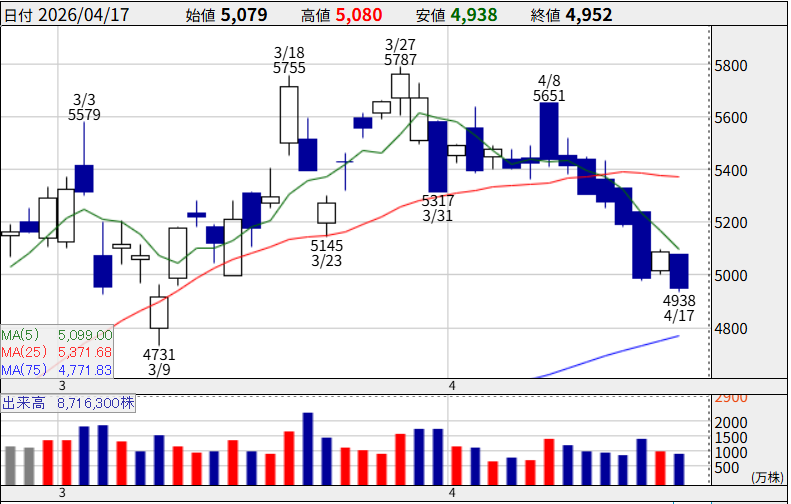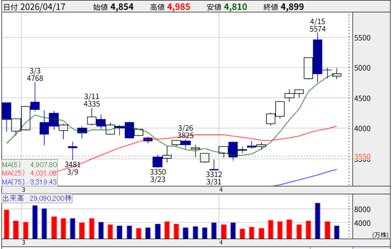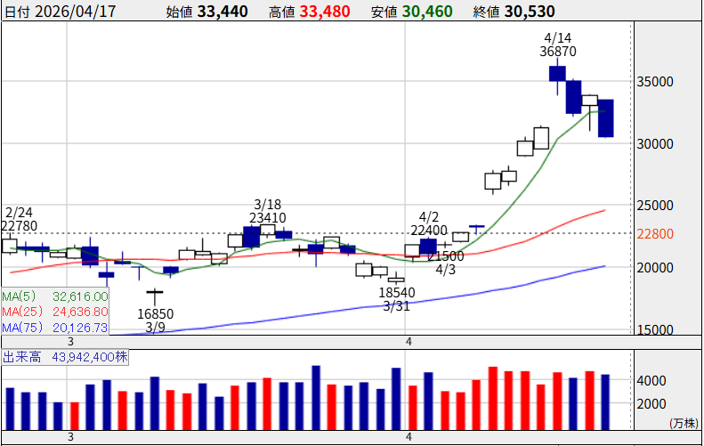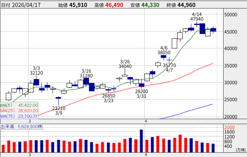 4月8日には単日で+17.61%上昇、14日には年初来高値47,940円を更新しました。