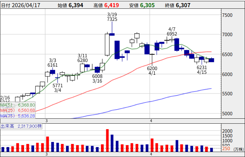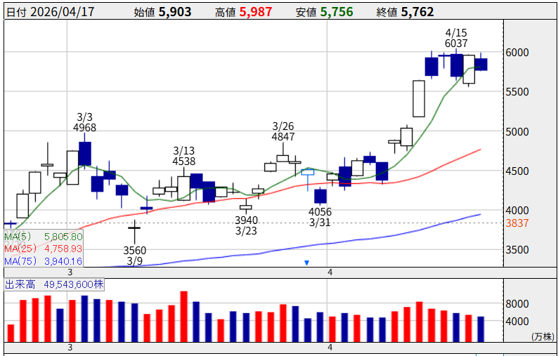 電線大手。AIデータセンター向け光ファイバー・電力ケーブル需要で4月16日に前日比+4.72%の5,951円で取引を終了。