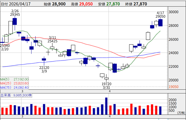4月10日に上場来初の3万円台(30,150円)に乗せ、売買代金は取引開始20分で2,000億円を突破。