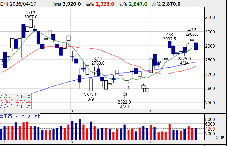 防衛費9兆円という政策追い風で2025年に大きく上昇しましたが、中東停戦ムードで利益確定売り。