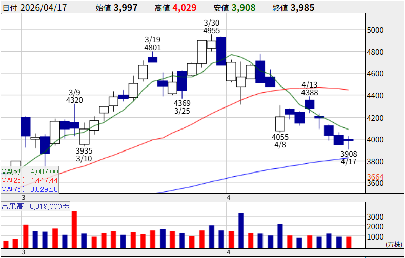 4月9日に一時4万5,000円台に乗せ、25年半ぶりの上場来高値を連日更新。