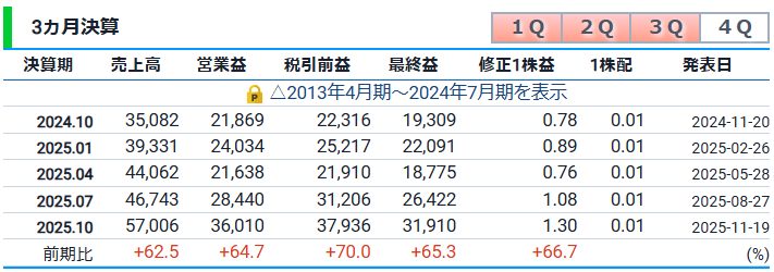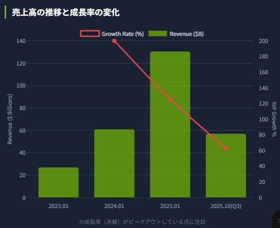 11月19日に発表された2025年10月期(第3四半期)決算では、売上高が約570億ドル(前年同期比約62.5%増)と、引き続き驚異的な数字を叩き出しました。