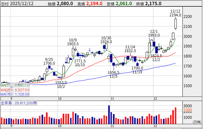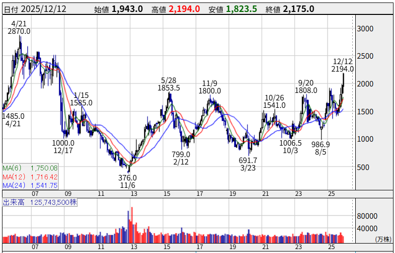 特に12月8日からの週は破竹の勢いで、12日には前日比7%高の2175円を記録。これは2008年9月のリーマン・ショック以降で最も高い水準(最高値)となります。