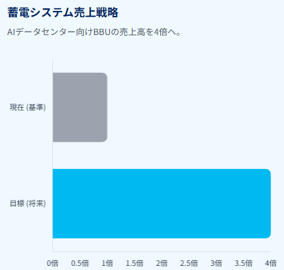 パナソニックは以前から車載電池(EV向け)で世界的なシェアを持っていましたが、ここに来て「データセンター向け蓄電システム」の売上高を4倍に増やすという野心的な戦略を打ち出しました。
