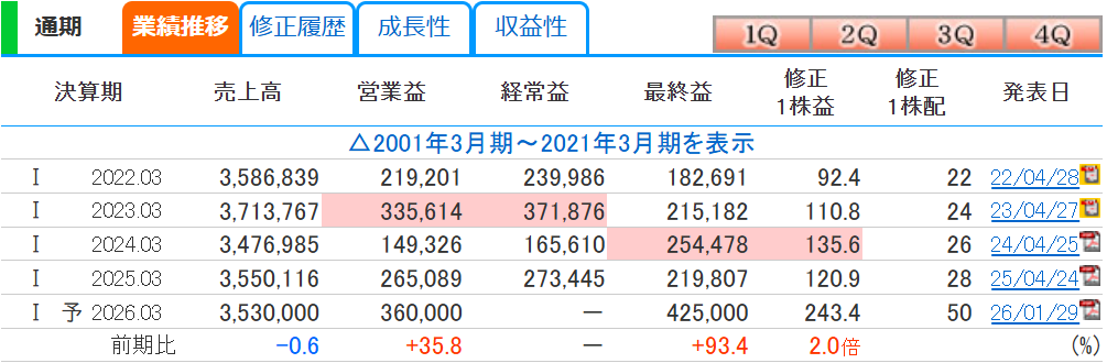 • 不採算事業も整理され、利益率が劇的に改善中。2026年3月期の純利益予想も2,500億円超と絶好調です。