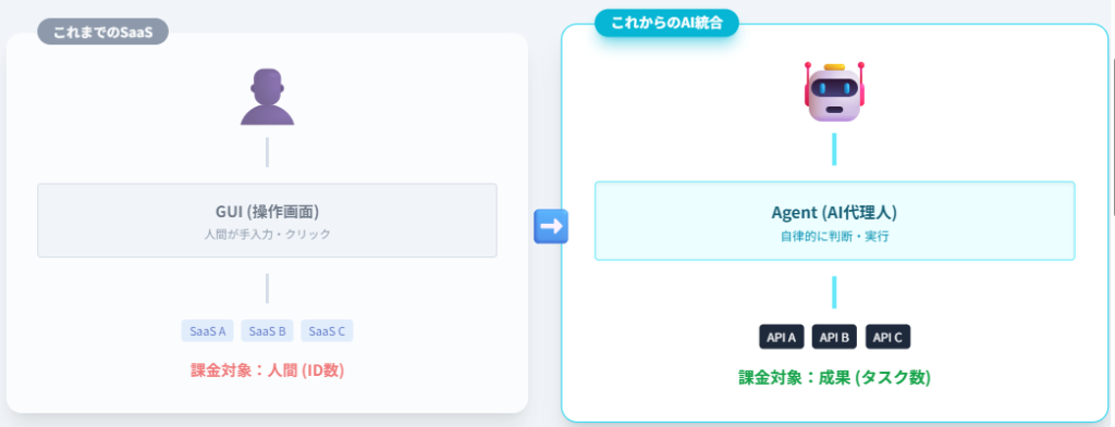これまでの「1ユーザー月額◯円(Seat-based)」は、人間が使わなくなるため破綻します。