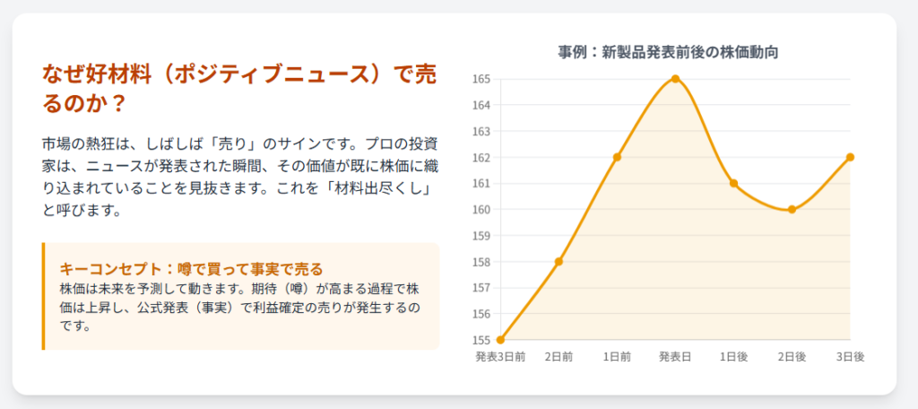 そして、実際にポジティブなニュースが発表された瞬間、先回りしていた投資家たちは「材料出尽くし」と判断し、利益を確定させるために一斉に売りに転じます。