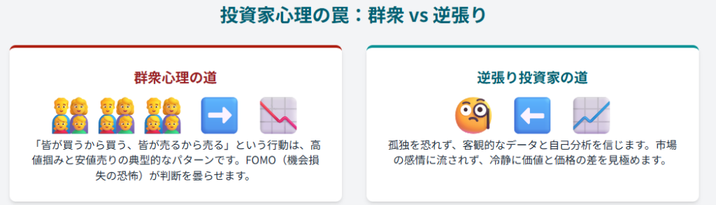 この群衆心理に流されるままでは、常に市場の後追いをすることになり、高値で買い、安値で売るという最悪のサイクルに陥ってしまいます。