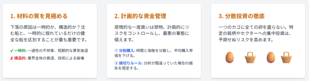 | タイミング | 優良株を割安な価格で仕込める可能性がある | 「落ちてくるナイフ」を掴むリスクがあり、買い時・売り時の判断が非常に難しい |