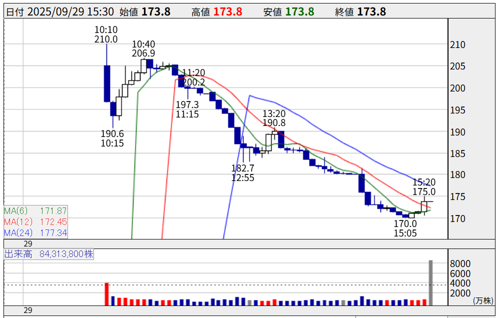 基準価格150円に対し、初値は205円と好調なスタートを切ったものの、その後は売りに押されて終値は173.8円に。