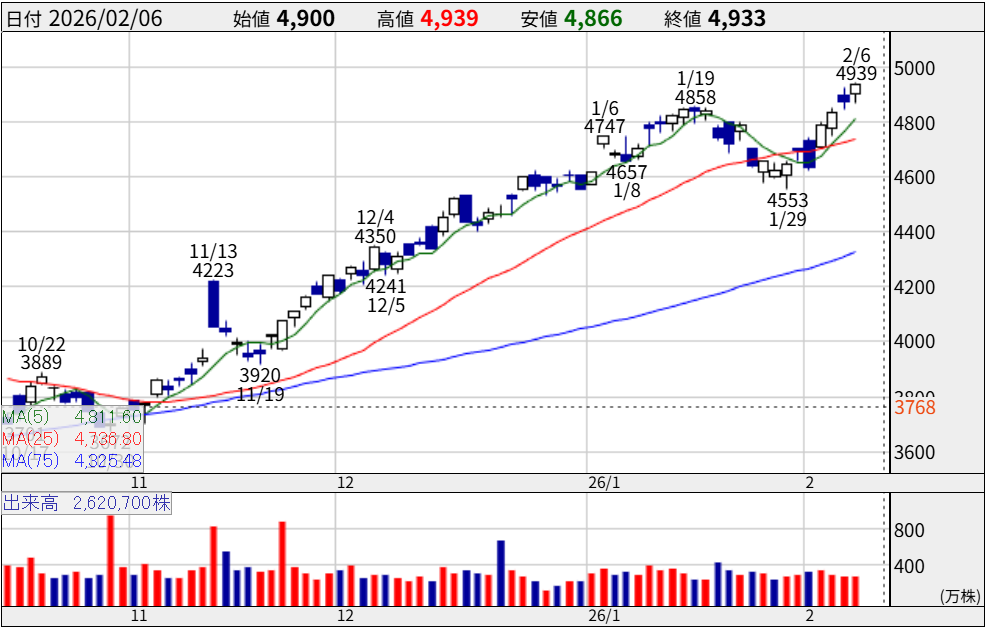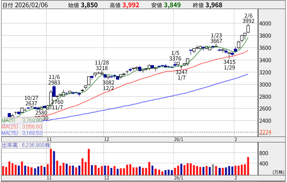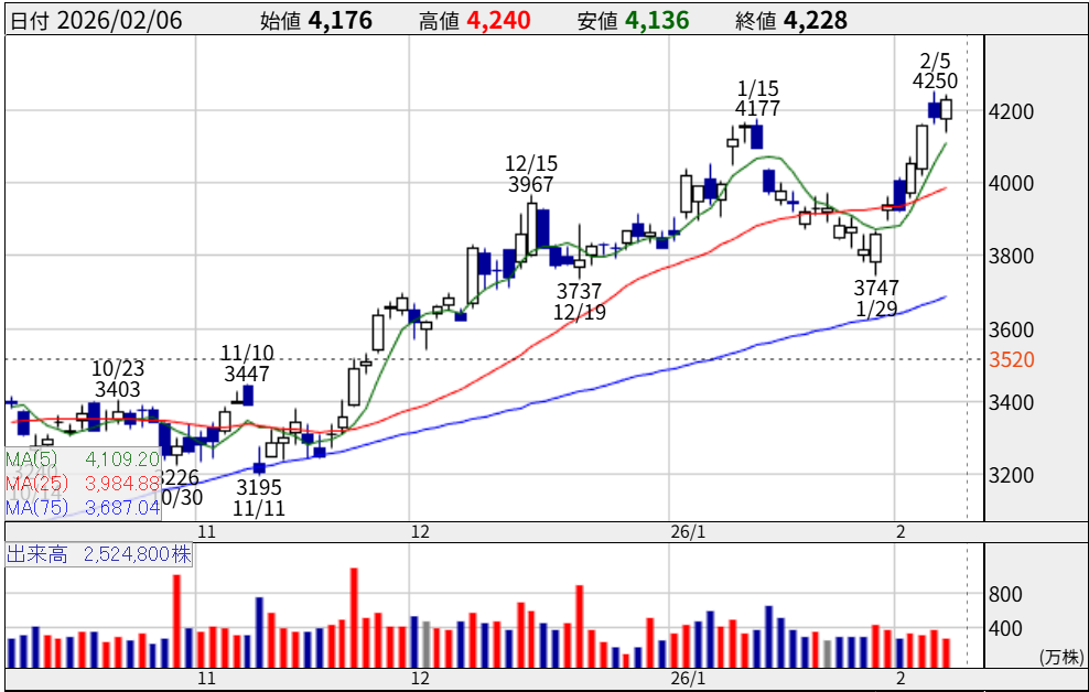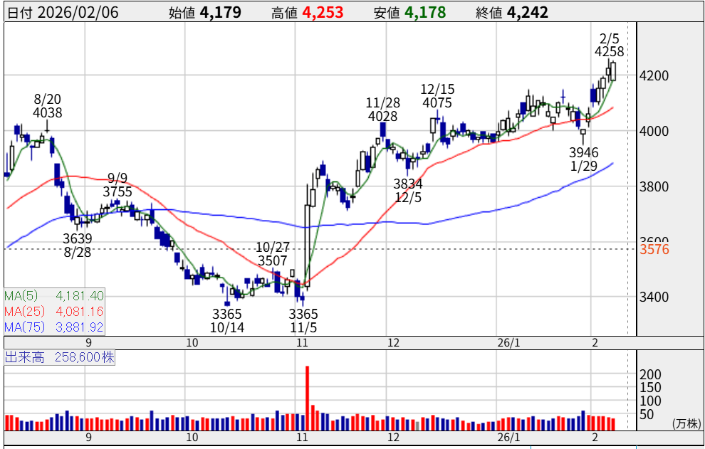 2026年2月現在、株価は約4,200円で推移しており、直近の高値を明確に更新しました。