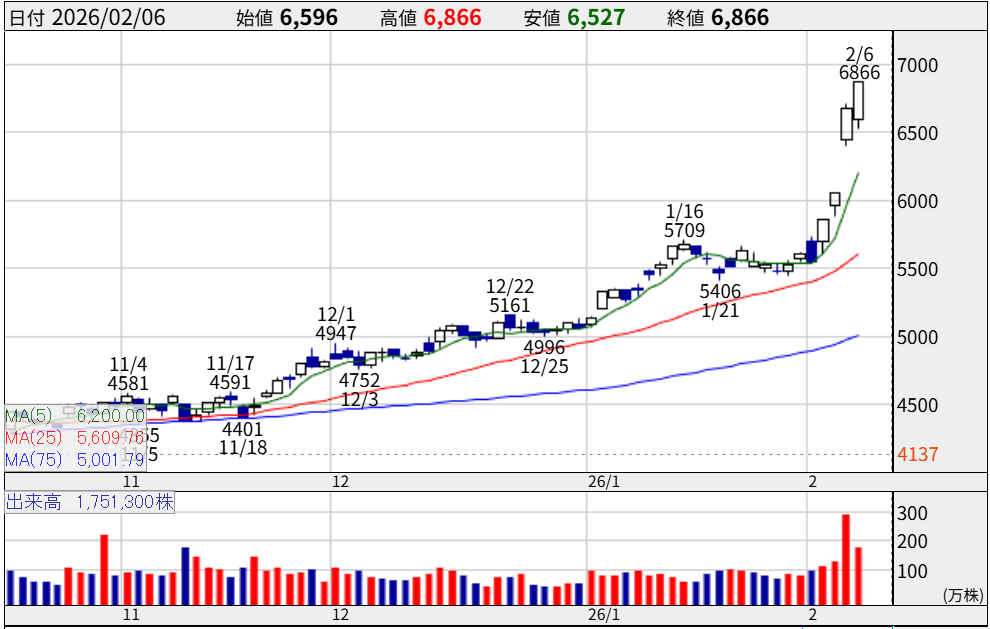 株価は6,866円。年初来高値を更新し続けており、強いモメンタムを感じさせます。