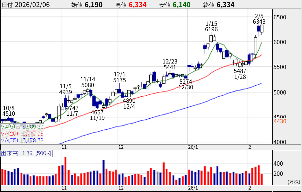 株価6,334円。上昇トレンドの真っ只中にあり、直近の高値更新が強力な買いシグナルを発しています。